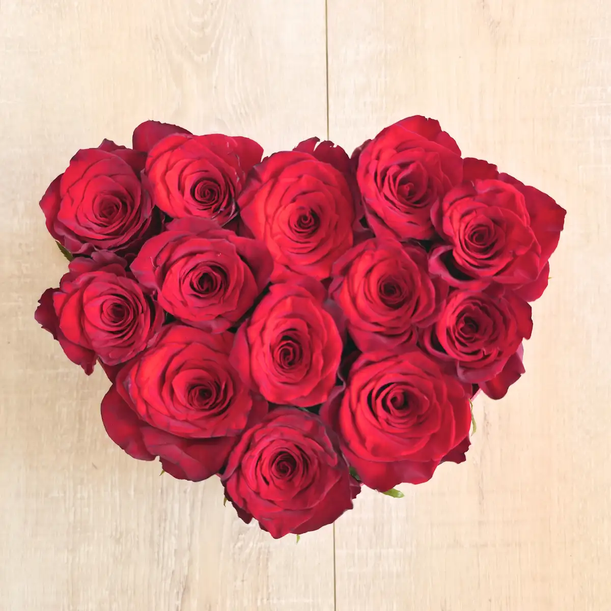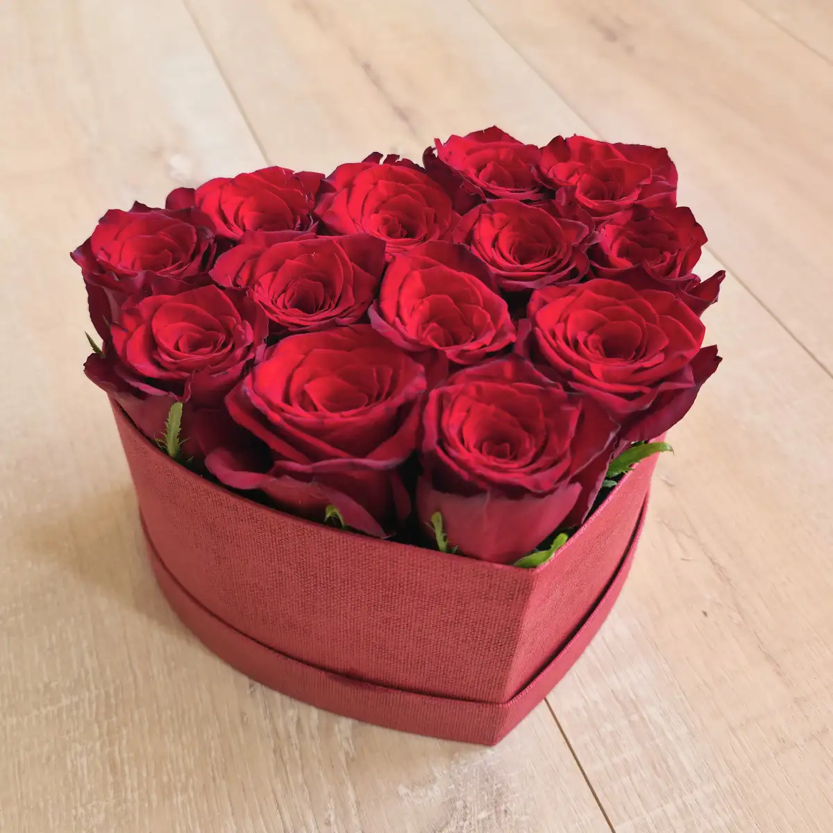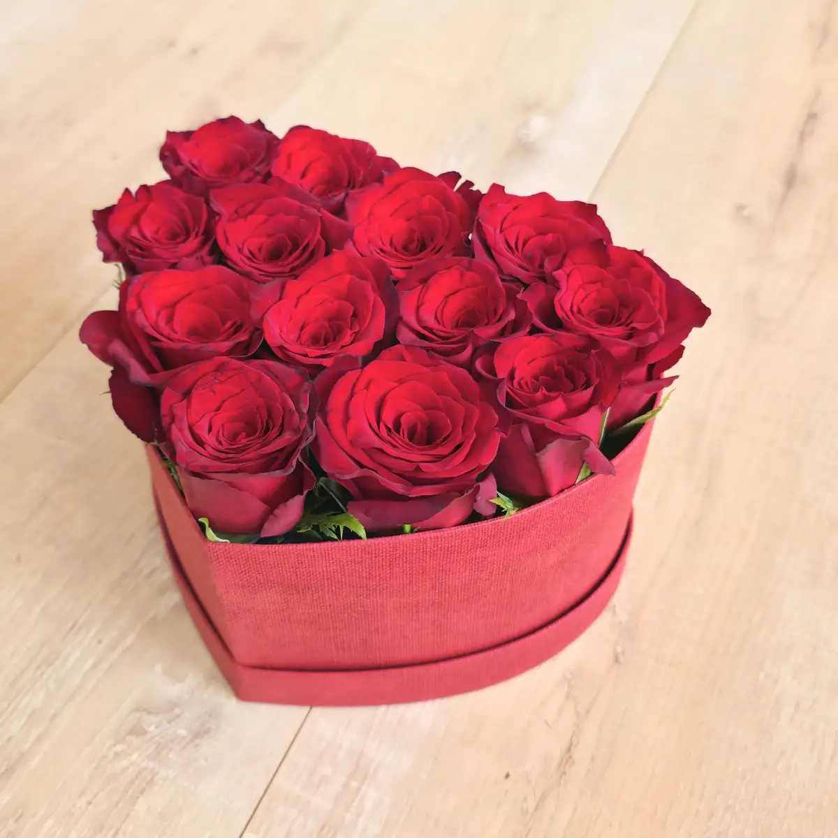 La forme cœur souligne naturellement le message porté par cette création. Cette composition assume pleinement la symbolique forte de la rose rouge : amour, passion et engagement.