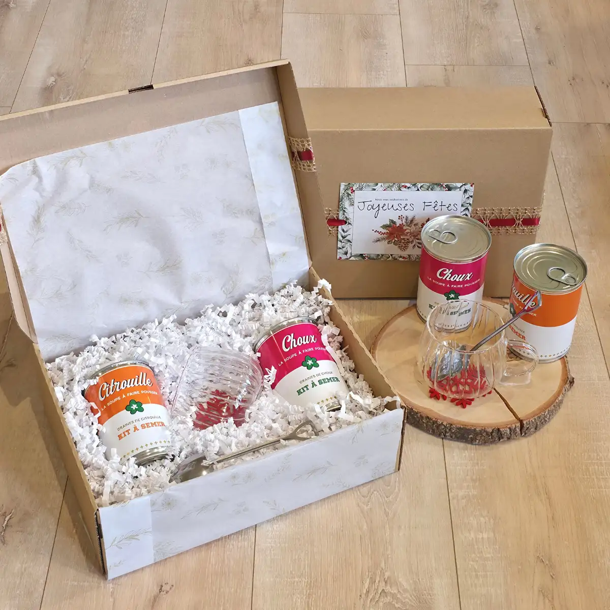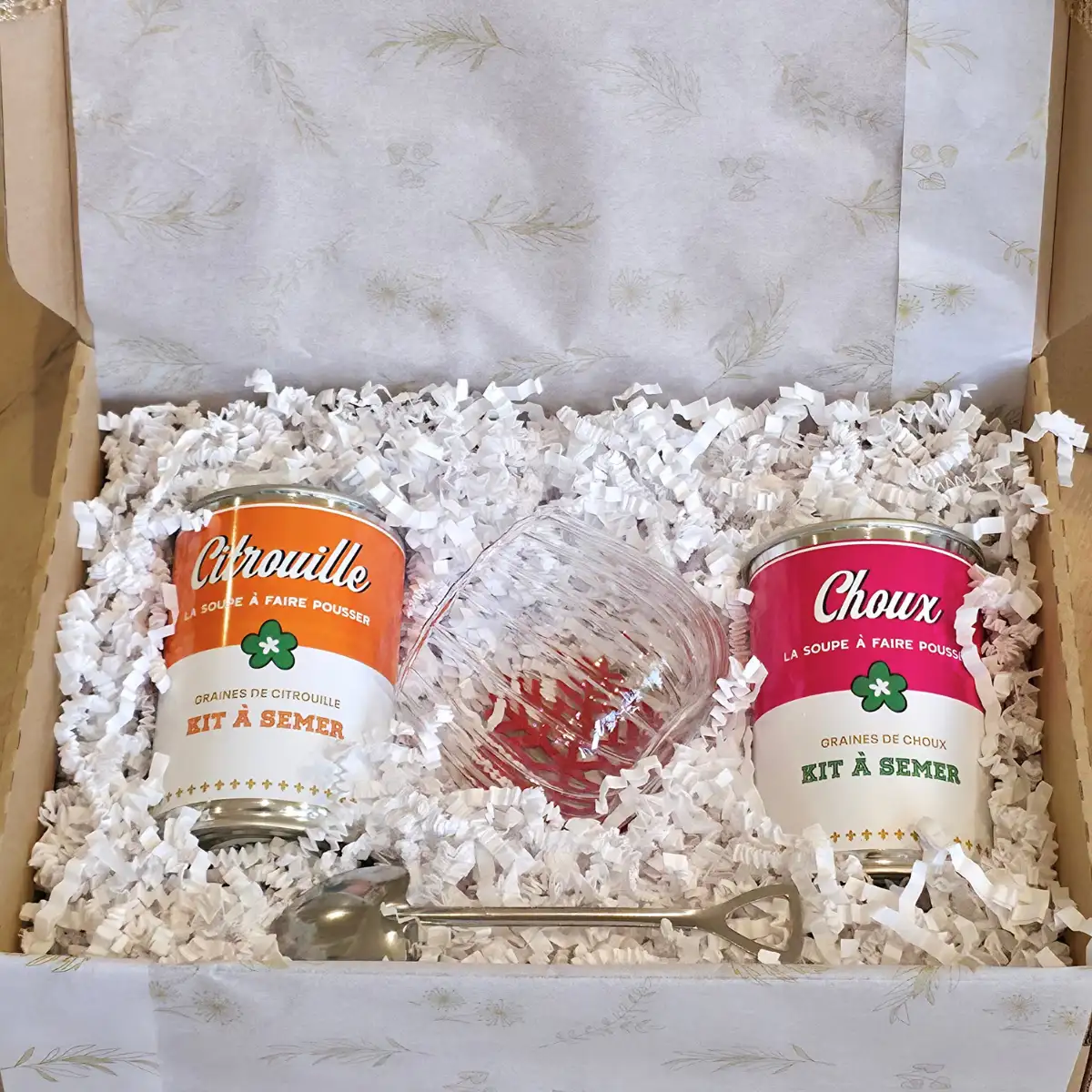 Nous emballons chaque coffret dans une boîte kraft avec papier de soie imprimé et bandeau de saison, afin de le proposer prêt à offrir. Grâce à cette présentation chaleureuse, il convient aussi bien aux passionnés de jardinage qu’aux amateurs d’objets poétiques.